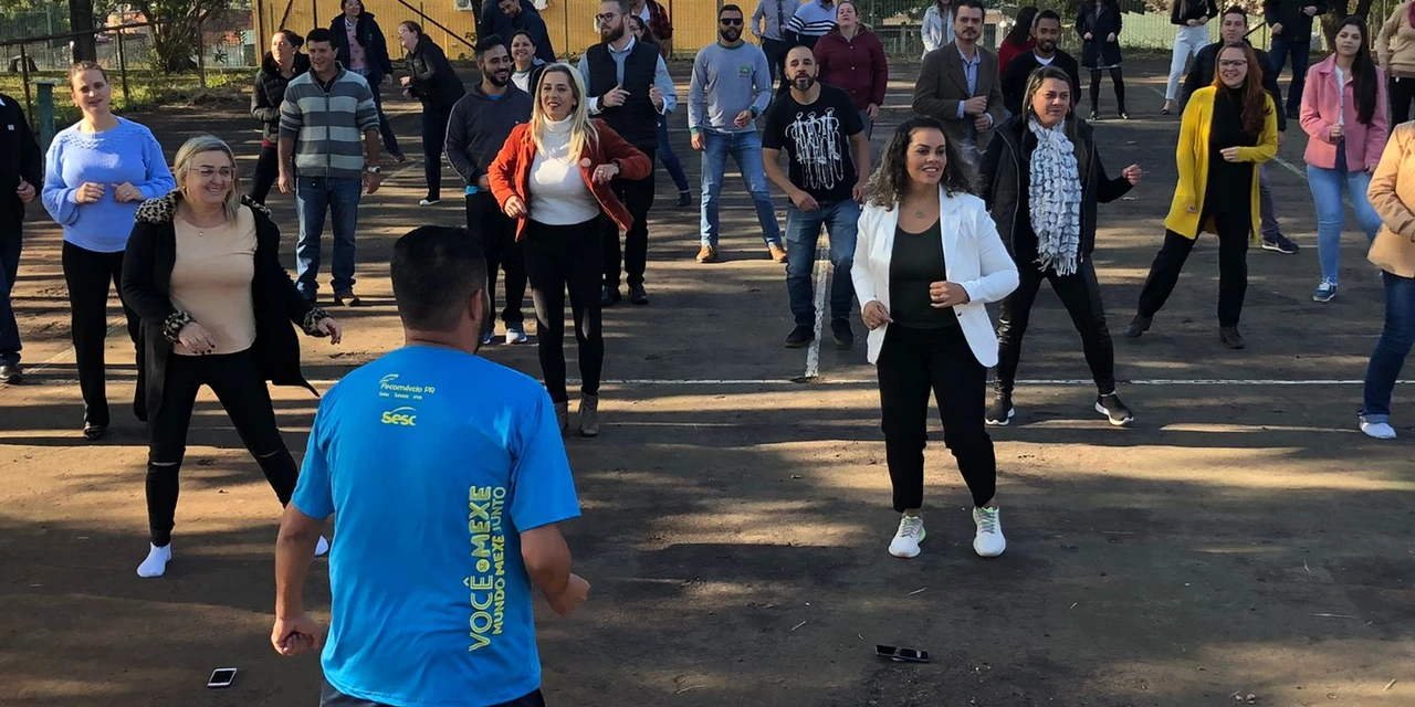 Logo pela manhã o professor Fabiano e sua equipe realizaram atividades de alongamento na quadra de esportes do Centro Administrativo Municipal. Diversos funcionários da Prefeitura também participaram do movimento, se preparando para a rotina de trabalho. Na Escola Municipal Romana Carneiro Kluppel as crianças também esquentaram o corpo com muito esporte e brincadeiras.