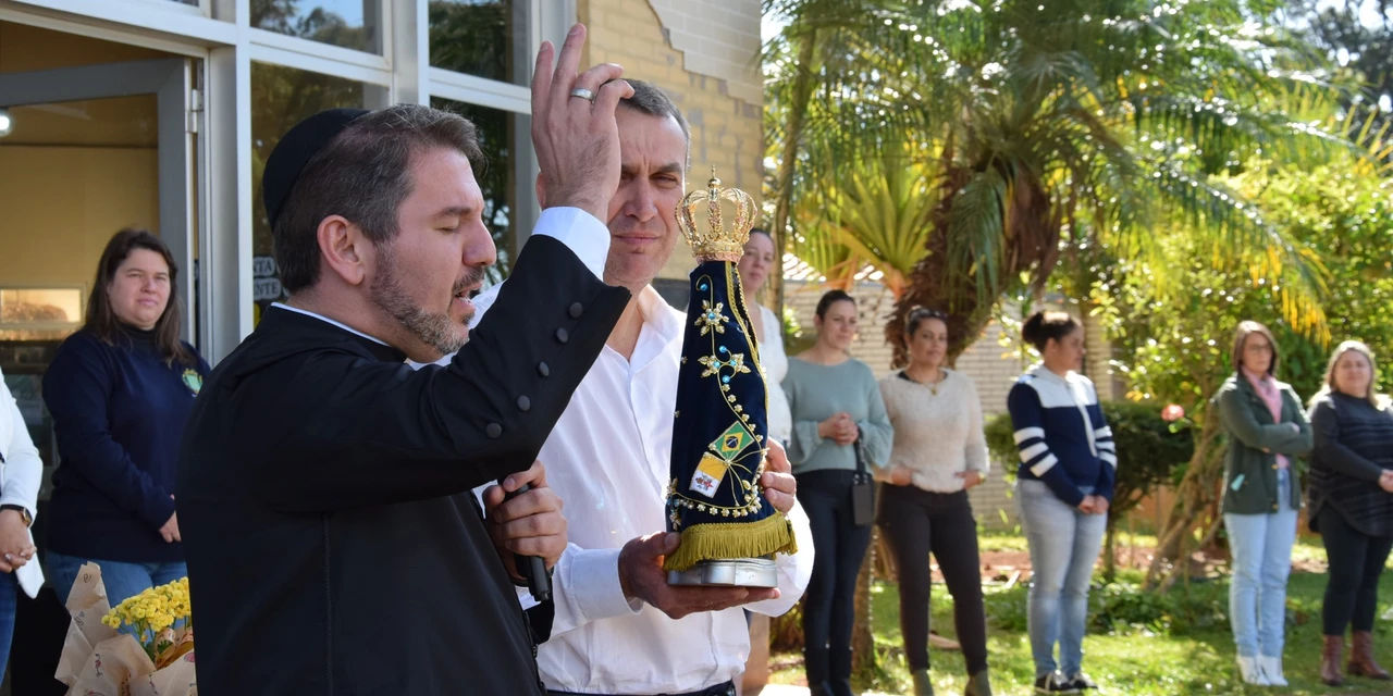 COM ASSESSORIAS - A Prefeitura Municipal acolheu nesta manhã (27) ensolarada a imagem de Nossa Senhora Aparecida, vinda diretamente do Santuário Nacional em Aparecida/SP. A visita realizada pelo Pároco Pe. Anderson Marchiori, da Paróquia São João Batista, trouxe bênçãos, paz e oração aos servidores municipais.