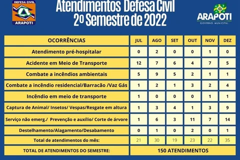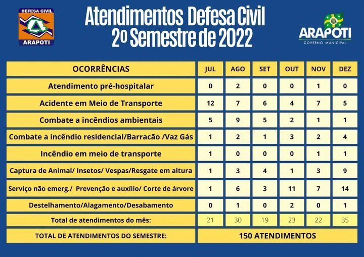 COM ASSESSORIAS - A Defesa Civil de Arapoti realizou 150 atendimentos no segundo semestre do ano passado, atendendo os mais diversos tipos de ocorrência. Esse detalhamento pode ser acompanhado na tabela que ilustra a postagem.