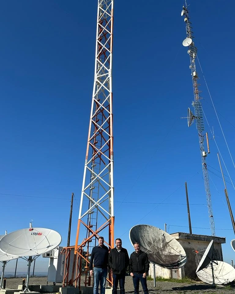 COM ASSESSORIAS - O prefeito Irani Barros e o vice-prefeito Potinho, acompanhados pelo servidor Leandro Furquim, visitaram o local onde foram implantadas as estações retransmissoras de TV Digital do município.