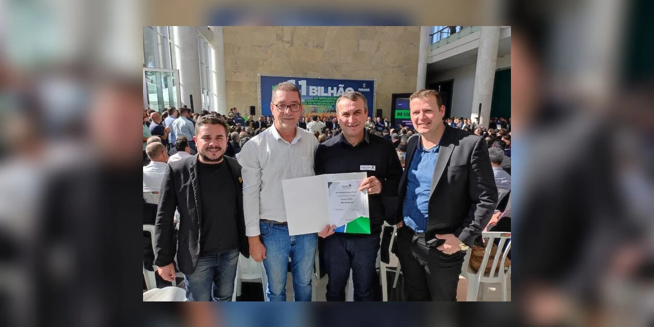 COM ASSESSORIAS - O Prefeito Irani Barros (PSDB) e o vice Potinho (MDB) participaram de cerimônia de assinatura de editais com a presença do Governador Ratinho Junior e outras autoridades do Estado. O presidente da Câmara de Vereadores Edilson Corsini (UNIÃO) e o vereador Maicon Pot (SD) também estiveram presentes acompanhando a liberação de recursos para o Município de Arapoti.