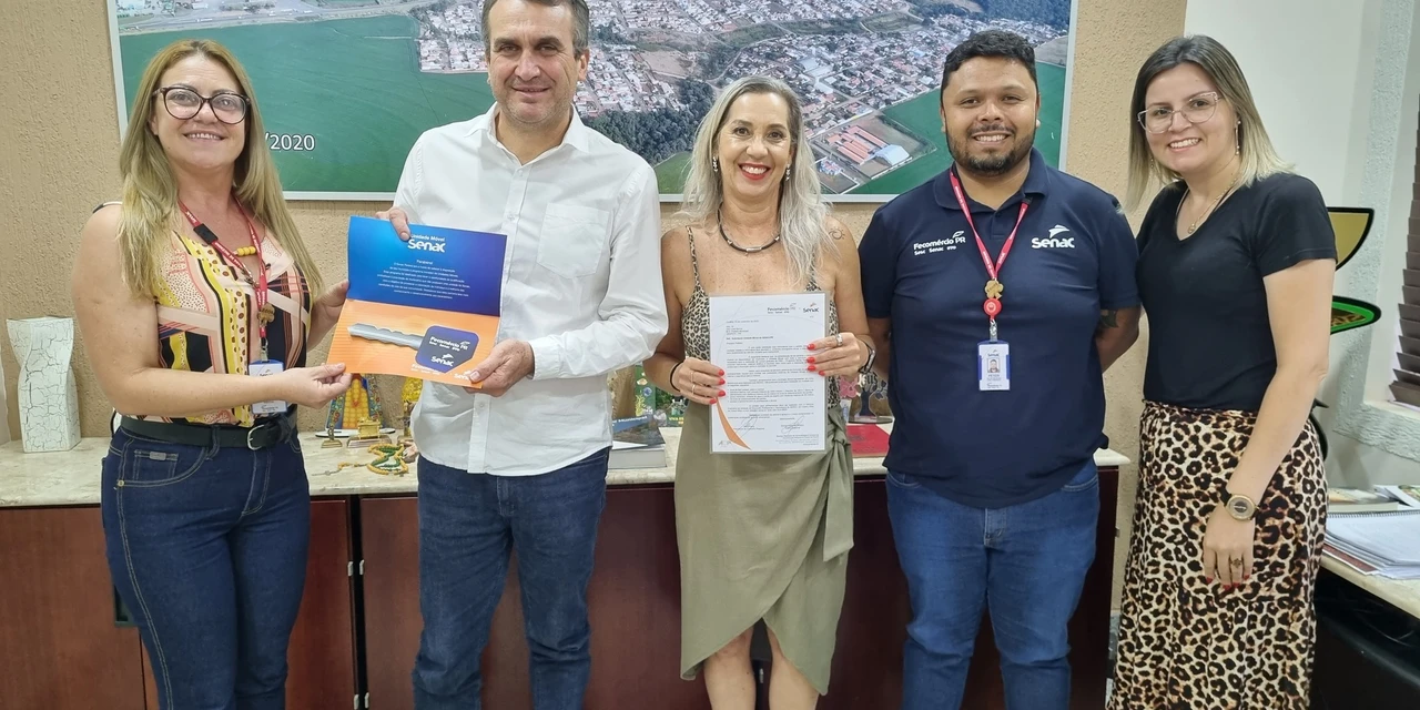 COM ASSESSORIAS - O prefeito Irani Barros e a secretária de Desenvolvimento Econômico Sandra Miller receberam representantes do SENAC para assinatura de convênio assegurando a chegada de mais uma carreta com curso profissionalizante da Instituição.