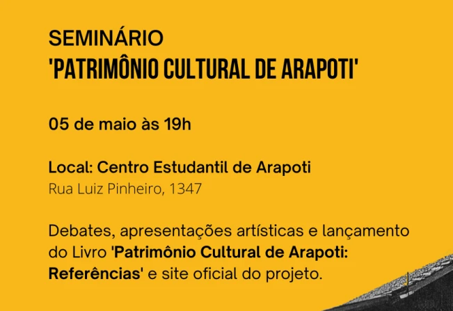 COM ASSESSORIAS - O Seminário ‘Patrimônio Cultural de Arapoti’ acontece na próxima quinta-feira (05 de maio), a partir das 19h no Centro Estudantil. Você é nosso convidado(a)!