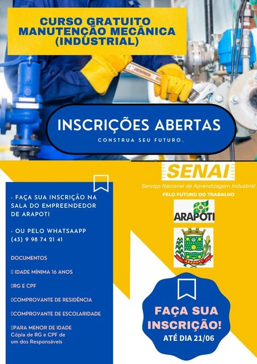 VAGAS LIMITADAS! Garanta a sua inscrição na Sala do Empreendedor de Arapoti ou pelo WhatsaApp (43) 99874-2141.