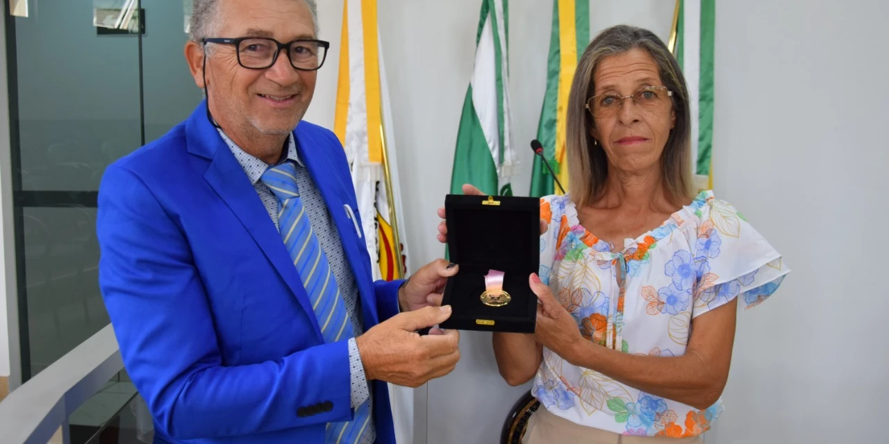 COM ASSESSORIAS - A servidora municipal aposentada, Rosilene de Jesus Melnik, recebeu nesta segunda-feira (28) a Comenda Alayde Carneiro Possatto (Dona Nena) conferida à mulheres destaque do município. O propositor da homenagem, vereador Buika (PSL), ressaltou que Rosilene sempre atuou junto à comunidade da Vila Romana com muito trabalho, orgulho e dedicação.