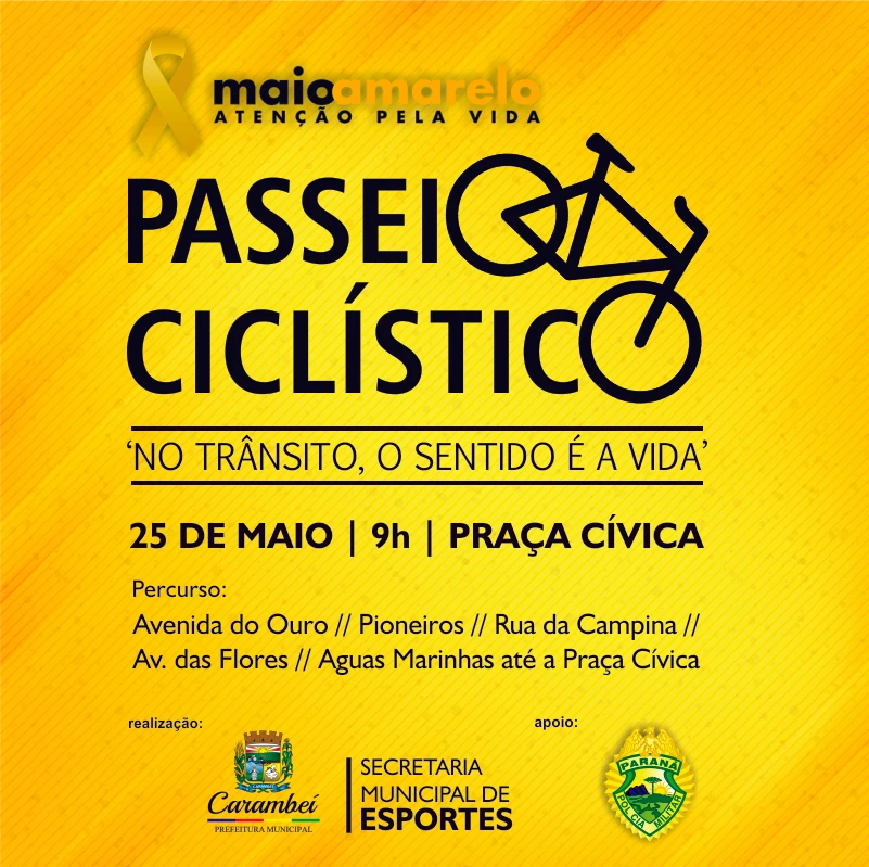IMPRENSA/Carambeí - A Prefeitura de Carambeí, por meio da Secretaria Municipal de Esportes, em conjunto com a Polícia Militar, promove neste sábado, às 9 horas, um passeio ciclístico que terá concentração na Praça Cívica. O evento integra as ações do Maio Amarelo, campanha que visa conscientizar usuários das vias públicas sobre a importância do respeito às leis de trânsito.