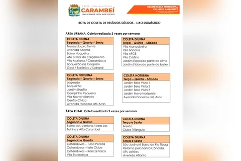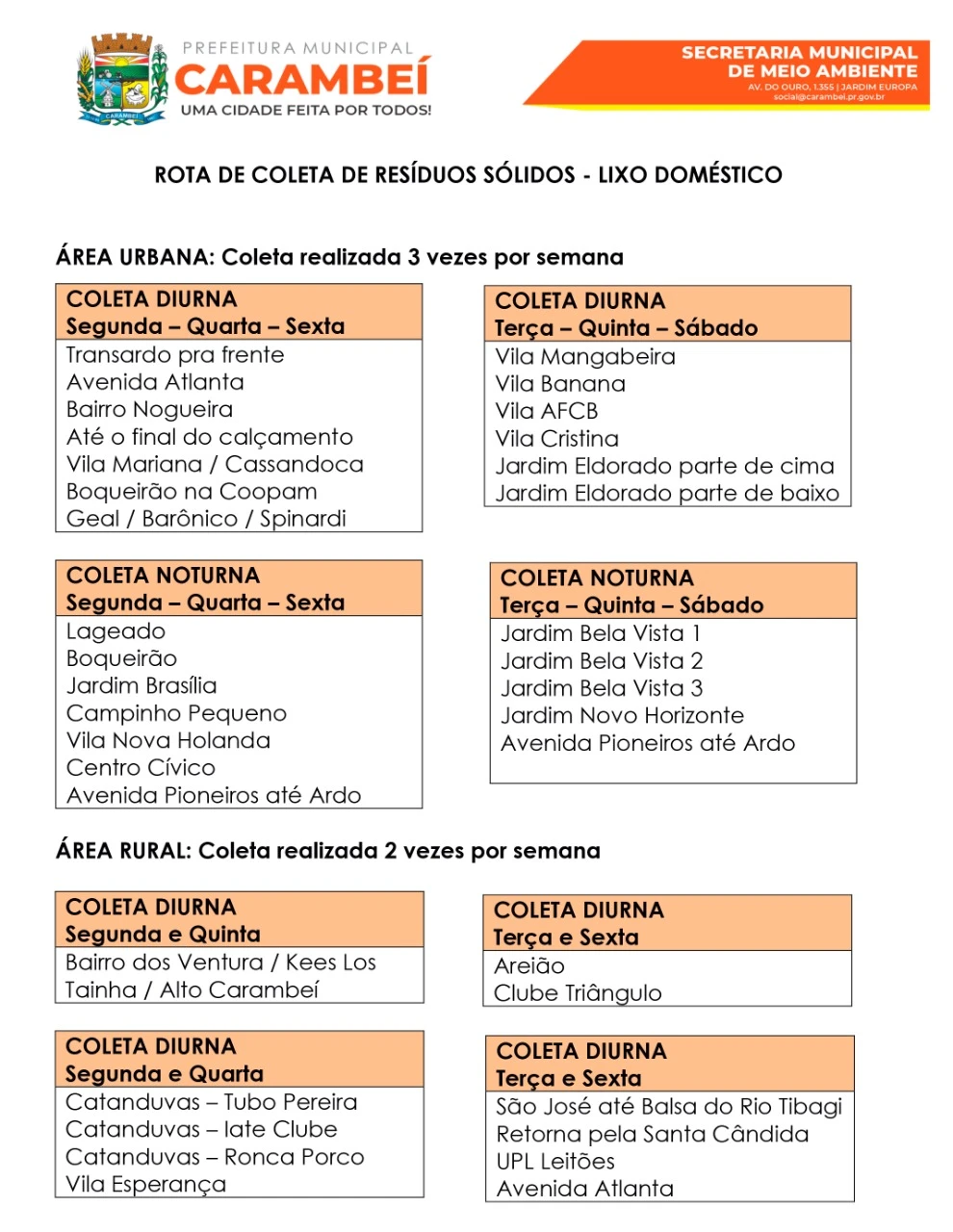 COM ASSESSORIAS - A Secretaria Municipal de Meio Ambiente de Carambeí divulgou esta semana a rota de coleta de resíduos sólidos, ou seja, coleta de lixo em que houve alteração apenas na coleta do jardim Eldorado, pois, a coleta passa a ser diurna no bairro inteiro.