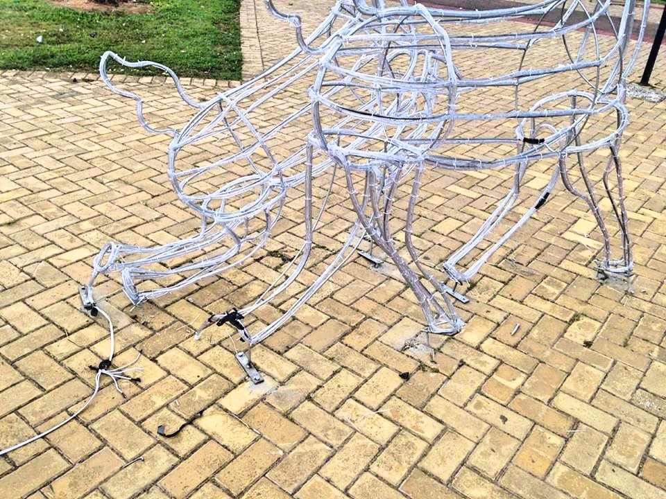 A secretária Municipal de Desenvolvimento, Aline Valer Macedo, relata que na sexta-feira (14), o vandalismo foi cometido em plena luz do dia. “Cortaram os fios de iluminação da praça, levaram conectores e tomadas. Sentaram sobre as renas, o que danificou, elas estavam chumbadas, chegou a quebrar os parafusos. Na sexta a noite não acendeu parte da iluminação devido ao vandalismo. Consertamos tudo durante o sábado, mas a noite, repetiu a depredação, mesmo situação, cortaram os fios, danificaram enfeites e levaram peças da ornamentação”, conta Aline.