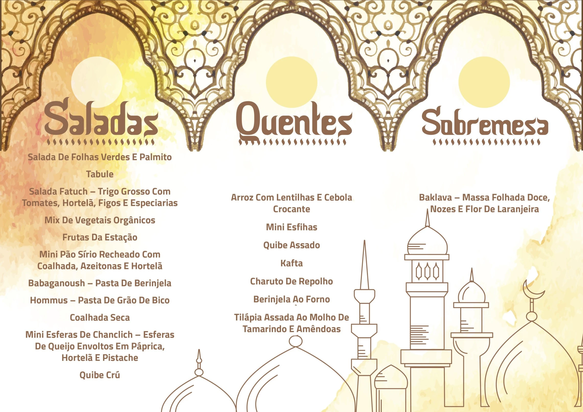 O menu será composto por novos drinks e um buffet repleto de deliciosos pratos. Confira abaixo o cardápio da Noite das Arábias.