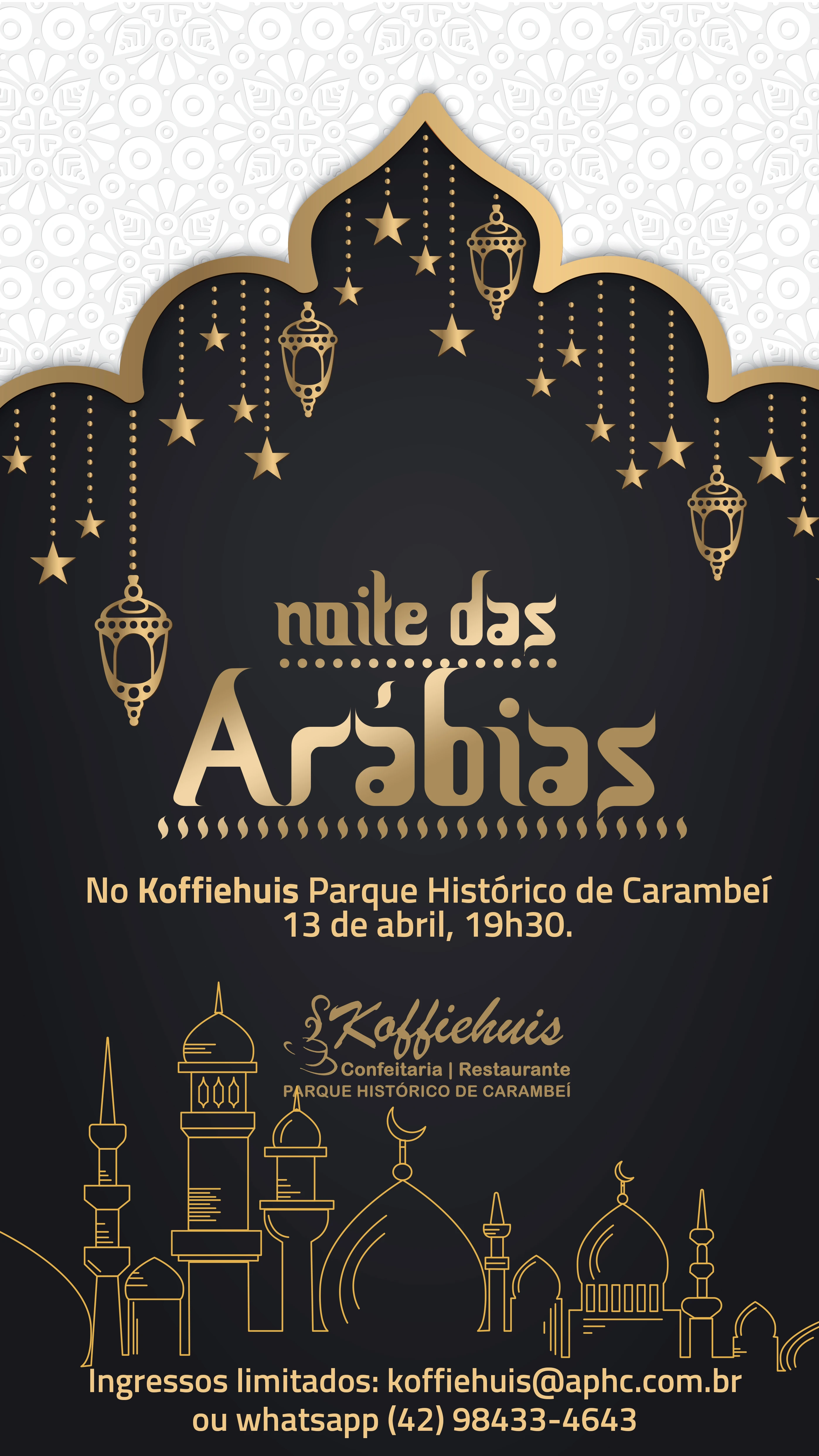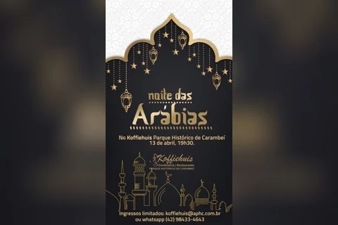Você que é apaixonado pela saborosa gastronomia árabe não pode perder a Noite das Arábias que o Koffiehuis Parque Histórico de Carambeí realizará no dia 13 de abril, às 19h30. Os ingressos são limitados e estão à venda no Koffiehuis, mais informações pelos telefones 42 3231-5876 e 98433-4643.
