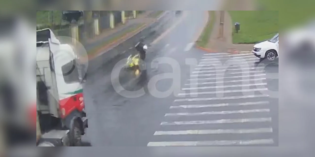 As imagens mostram que o motociclista trafegava na Avenida dos Pioneiros, que possui pista simples e estava com o asfalto molhado. Ele estava atrás de um caminhão e, quando tenta fazer uma conversão à esquerda, acaba deslizando e sofrendo uma queda já na pista contrária.