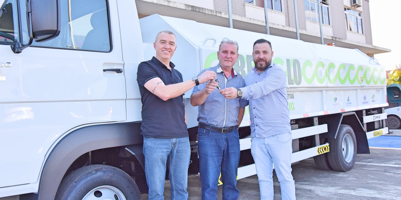 O prefeito Osmar Blum (PSD) entregou as chaves do caminhão ao secretário municipal de Meio Ambiente, Rosney Ribeiro, que vai providenciar o emplacamento do veículo que será cedido em comodato para a Cooperativa Ambiental de Carambeí – Coopam.