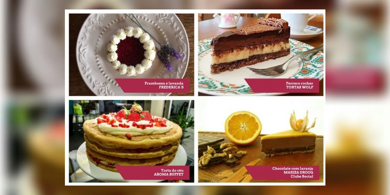 Com receitas autorais especialmente produzidas para o Festival de Tortas "Rota das Tortas", o evento de muitos sabores promete uma deliciosa aventura gastronômica. A Rota inicia com a torta Ferrero Rocher da Tortas Wolf, segue esse doce caminho para a inusitada torta de Framboesa e lavanda, da Frederica´s Koffiehuis, o próximo ponto Aroma Buffet e Eventos promete te levar às alturas com a Torta do Céu.