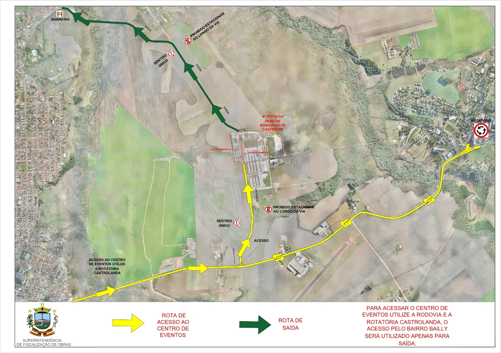 COM ASSESSORIAS - Começa nesta sexta-feira (17) a programação oficial da 4ª Festa do Peão de Boiadeiro de Castro. A Prefeitura estima que o Parque de Exposições Dario Macedo irá receber alto fluxo de pessoas ao longo dos três dias de evento. Pensando na segurança dos visitantes ao local e na organização do trânsito de veículos e de pessoas que irão passar pelo evento, a Diretoria de Segurança Pública da Prefeitura de Castro instituiu um novo modelo de rota para acesso ao Parque de Exposições. Também foram delimitados os espaços destinados para estacionamento no local.