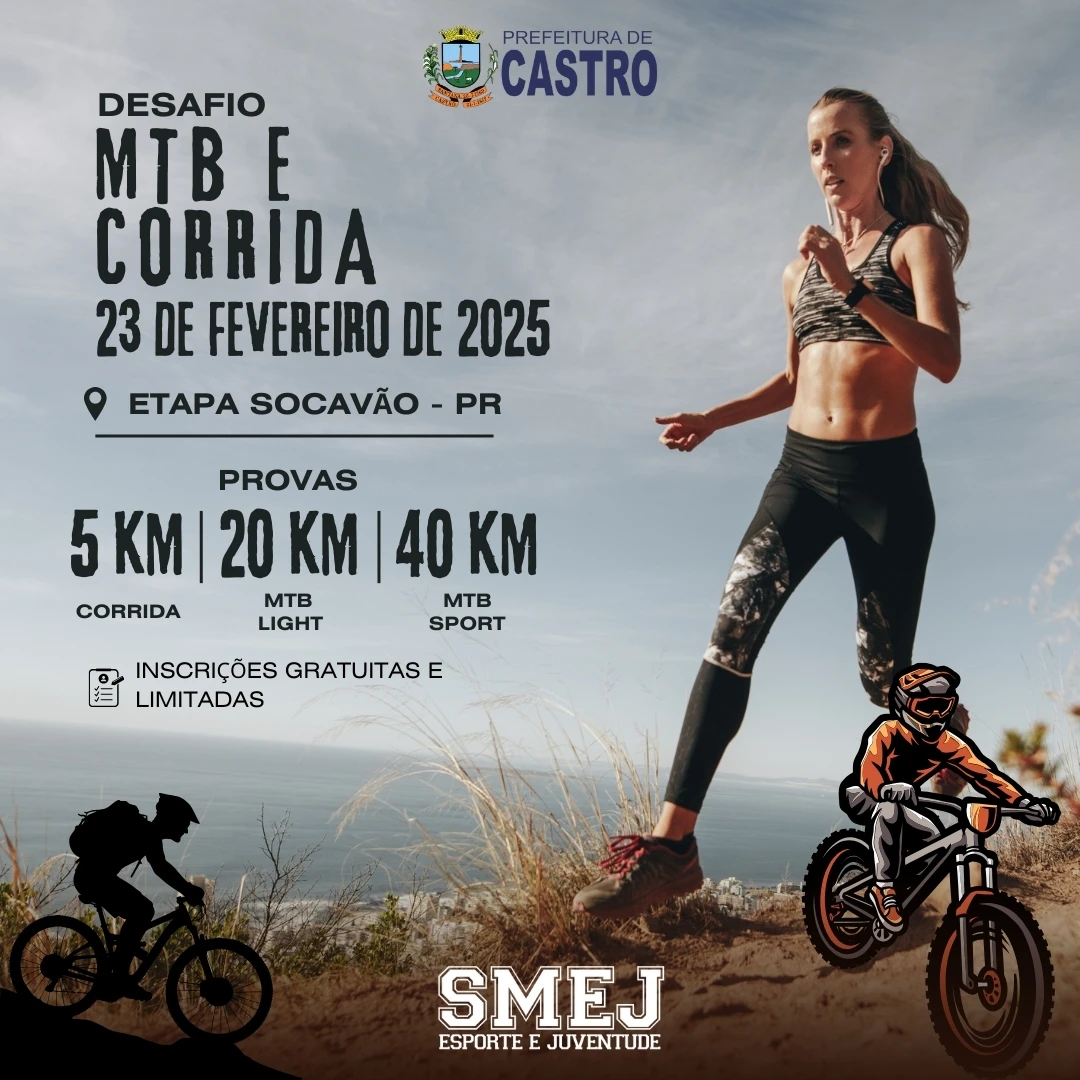 COM ASSESSORIAS - Estão abertas as inscrições para o Desafio MTB e Corrida – Etapa Socavão, promovido pela Secretaria Municipal de Esportes. O evento será dia 23 de fevereiro com inscrições totalmente gratuitas para moradores de Castro, que podem ser feitas até dia 19, ou até serem completadas todas as 350 vagas.