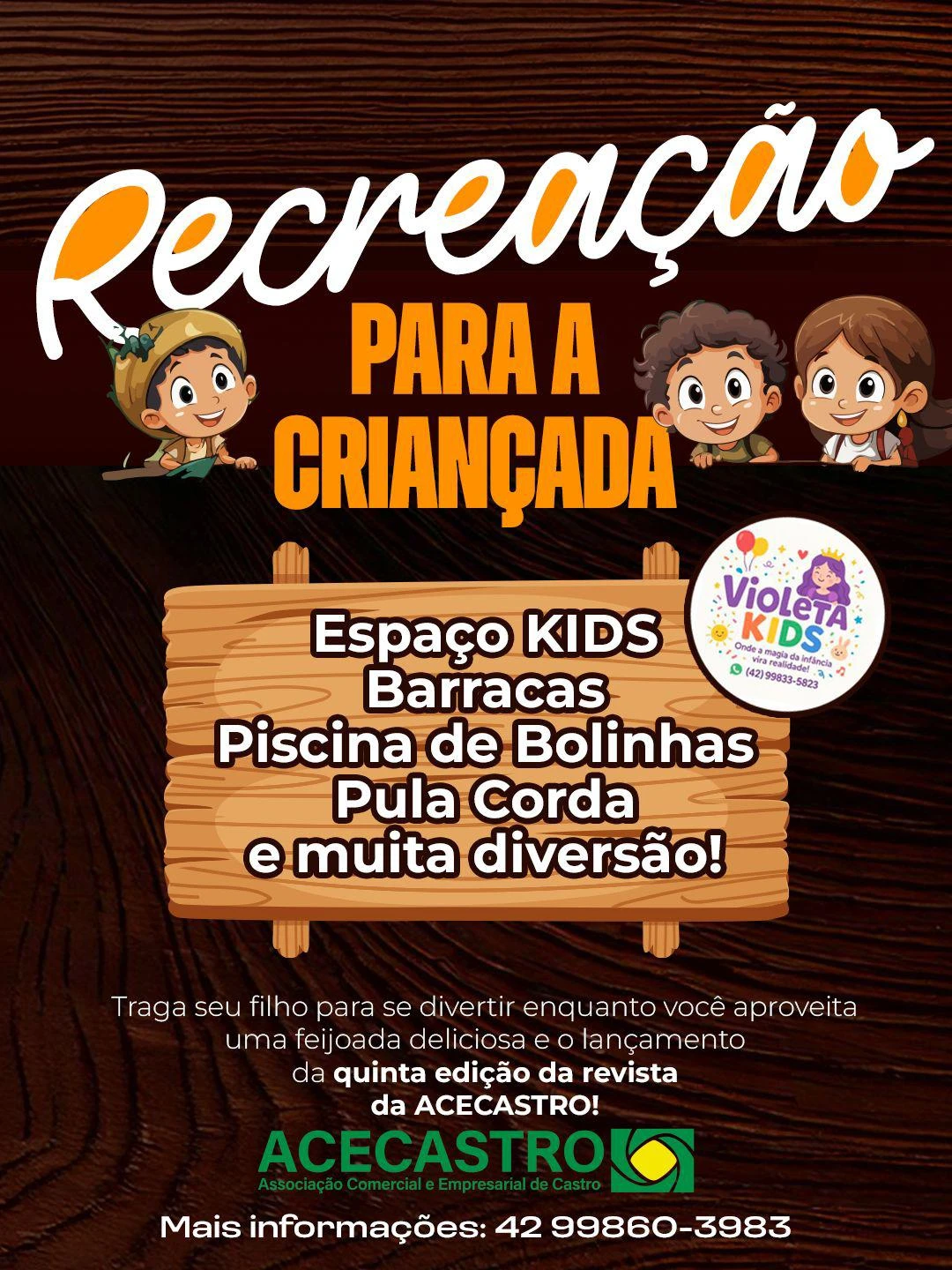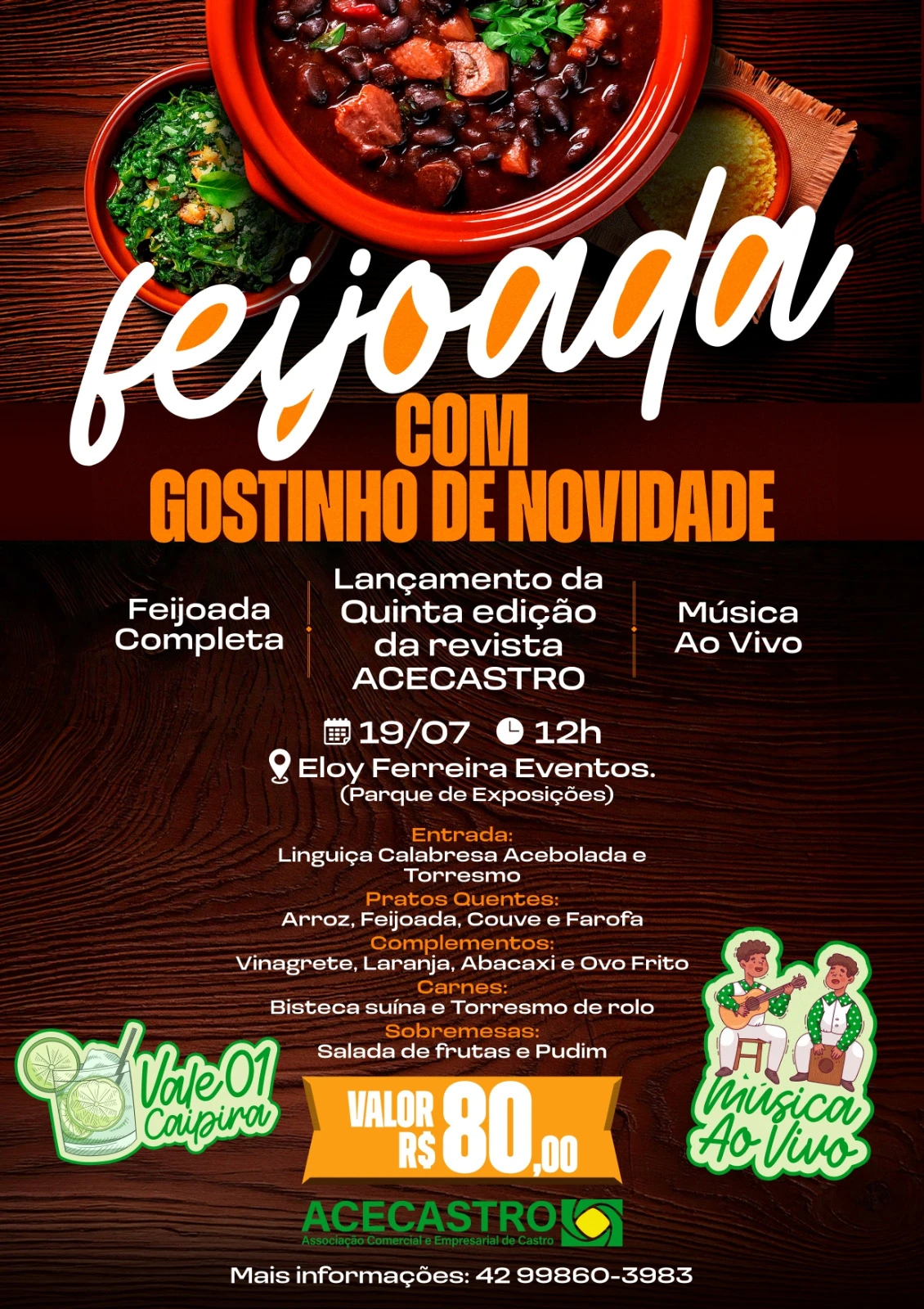COM ASSESSORIAS - 'Feijoada com gostinho de novidade': um almoço especial marcará o lançamento da quinta edição da Revista Acecastro, neste sábado (19), no espaço Eloy Ferreira (Parque de Exposições). Ainda restam alguns lugares no evento, que terá música ao vivo e recreação para as crianças, com espaço kids, barracas, piscina de bolinhas e pula corda. A participação é por adesão e custa R$ 80, com direito a um vale-caipirinha. A reserva pode ser feita pelo WhatsApp (42) 99860-3983.