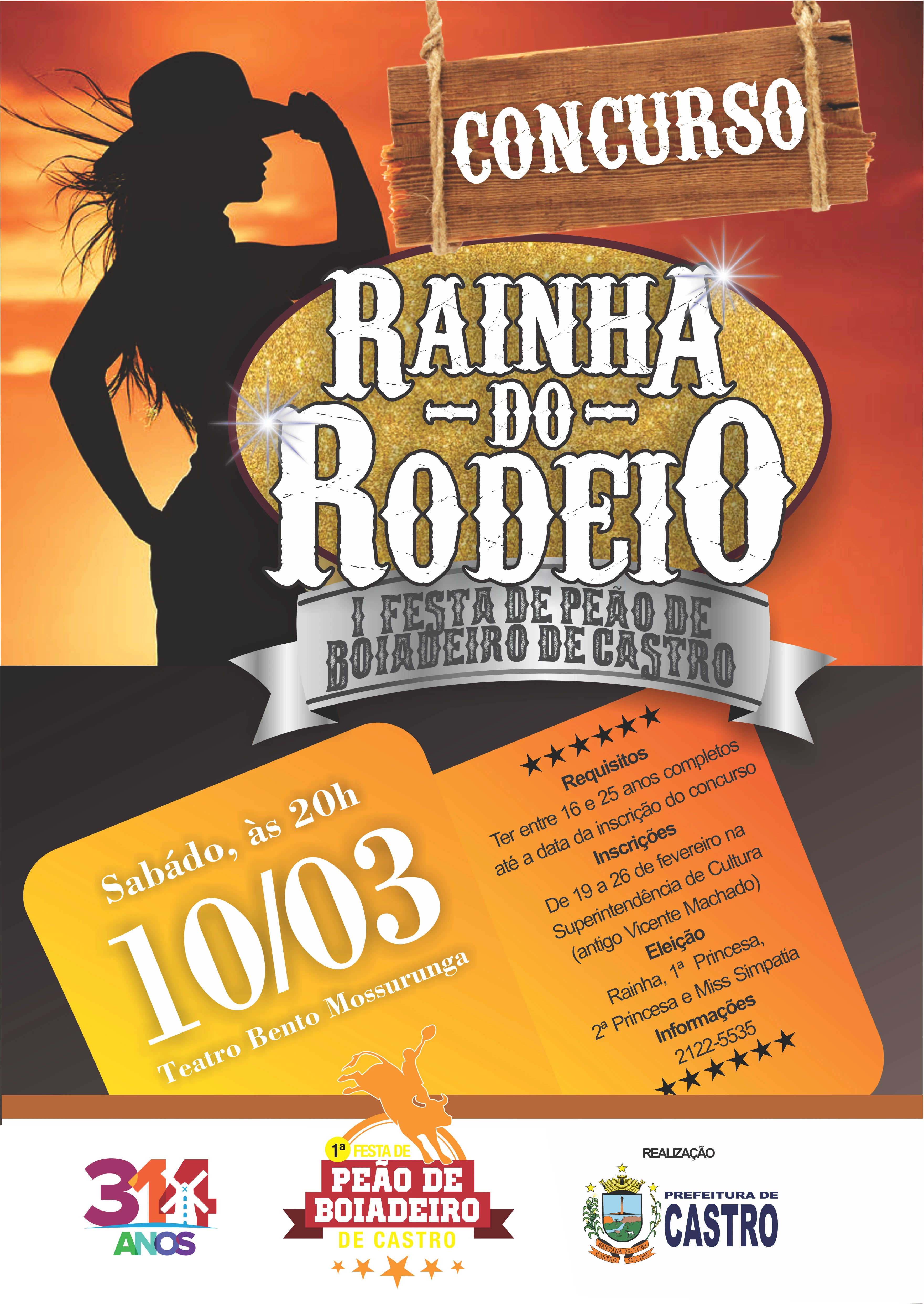 IMPRENSA/Castro - A Rainha da 1ª Festa de Peão de Boiadeiro de Castro que será realizada de 16 a 19 de março, será escolhida neste sábado (10) no Teatro Bento Mossorunga, a partir das 20 horas, com entrada franca. Treze candidatas se apresentarão no palco do teatro e uma comissão julgadora que avaliará os quesitos beleza, plástica corporal, desenvoltura e elegância, simpatia e capacidade de comunicação. As finalistas serão escolhidas por critério de pontuação em ordem decrescente para as posições de Rainha, 1ª Princesa, 2ª Princesa e Miss Simpatia.