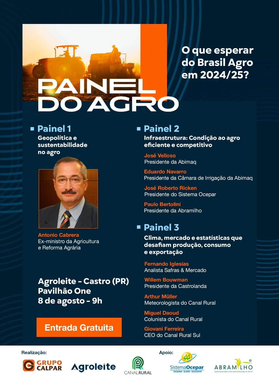 O segundo tema do Painel será 'Infraestrutura: condição ao agro eficiente e competitivo', com José Velloso, presidente da Abimaq; Eduardo Navarro, presidente da Câmara de Irrigação da Abimaq, e José Roberto Ricken, presidente do Sistema Ocepar, mediados por Paulo Bertolini, presidente da Abramilho.
