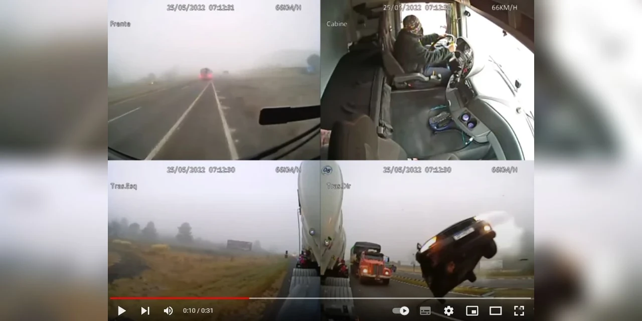 Como mostra o vídeo, filmado por quatro ângulos diferentes (frente, cabine e traseiras direita e esquerda), o motorista de um dos caminhões envolvidos dirigia normalmente pela rodovia pouco depois das 7h10 da manhã, quando foi surpreendido por um carro que veio pela direção contrária capotando pela pista.