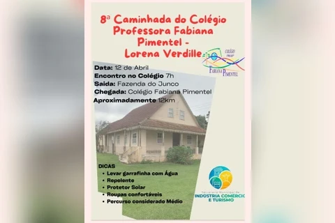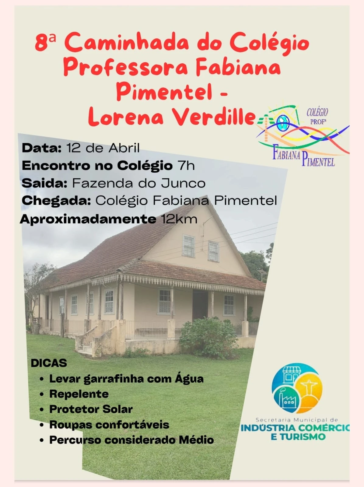COM ASSESSORIAS - A 8ª Caminhada do Colégio Professora Fabiana Pimentel Lorena Verdille acontece neste domingo (12), no distrito do Socavão, com concentração a partir das 7 horas no Colégio Fabiana Pimentel.