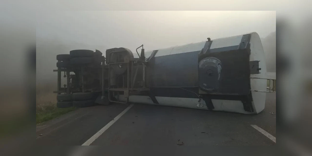 Segundo o motorista, a traseira da carga saiu da pista e o caminhão tombou. Há neblina no local.