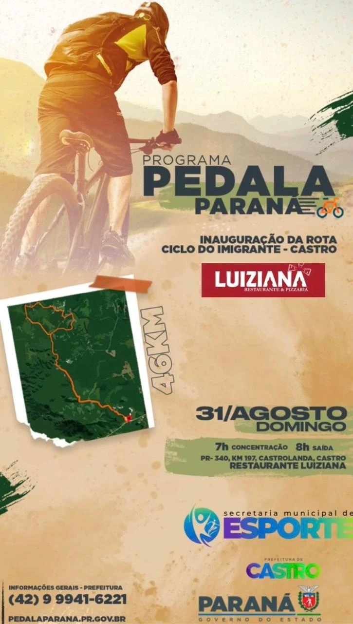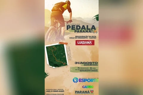 COM ASSESSORIAS - A partir desse domingo (31), o município de Castro passa a contar com uma ciclorrota. Chamada de ‘Caminho do Imigrante’, o percurso conta com 46 km e tem como ponto de partida o restaurante Luiziana, na PR-340, e percorre estradas rurais do município, passando por localidades como Garibaldi, Maracanã e Terra Nova. A inauguração será marcada por um passeio ciclístico aberto a pessoas de todas as idades. A participação é gratuita, com inscrições disponíveis no site da Prefeitura: castro.atende.net.
