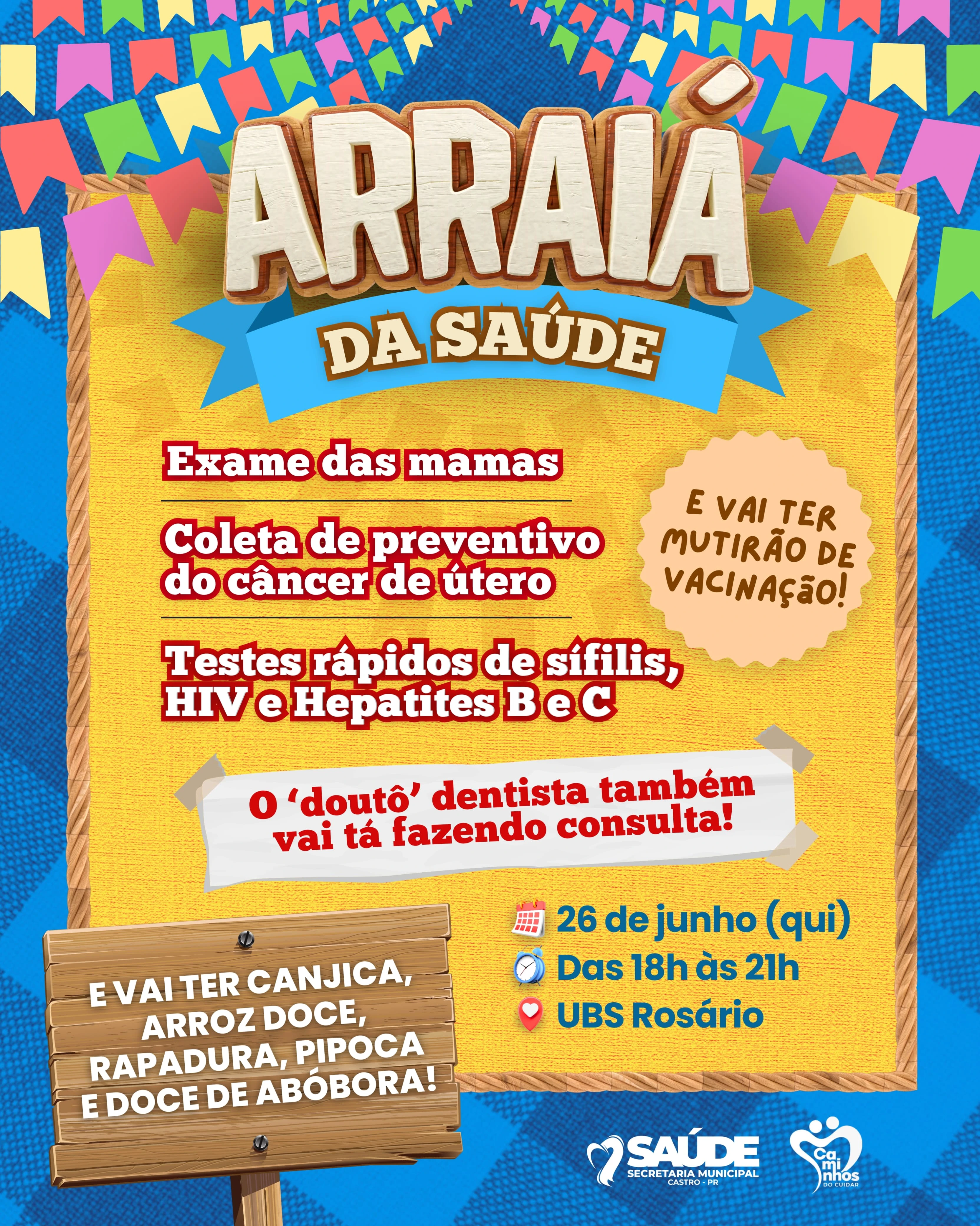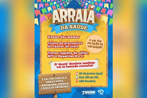 COM ASSESSORIAS - A Unidade Básica de Saúde (UBS) Vila Rosário realiza, nesta quinta-feira (26), o ‘Arraiá da Saúde’. A iniciativa visa promover ações e exames preventivos para a população. O ‘Arraiá’ conta com exames de mama, coletas de preventivo do câncer de útero e testes rápidos de doenças como sífilis, HIV e Hepatite (tipo B e C). Além dos exames, também haverá consultas odontológicas e mutirão de vacinação.