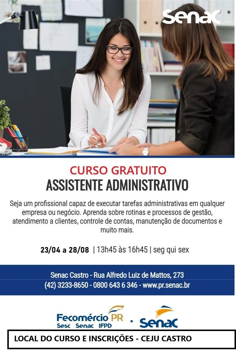 COM ASSESSORIAS - Uma nova oportunidade de qualificação profissional está disponível em Castro. O Senac está com inscrições abertas para o curso gratuito de Assistente Administrativo, voltado a quem deseja ingressar ou se aprimorar no mercado de trabalho.