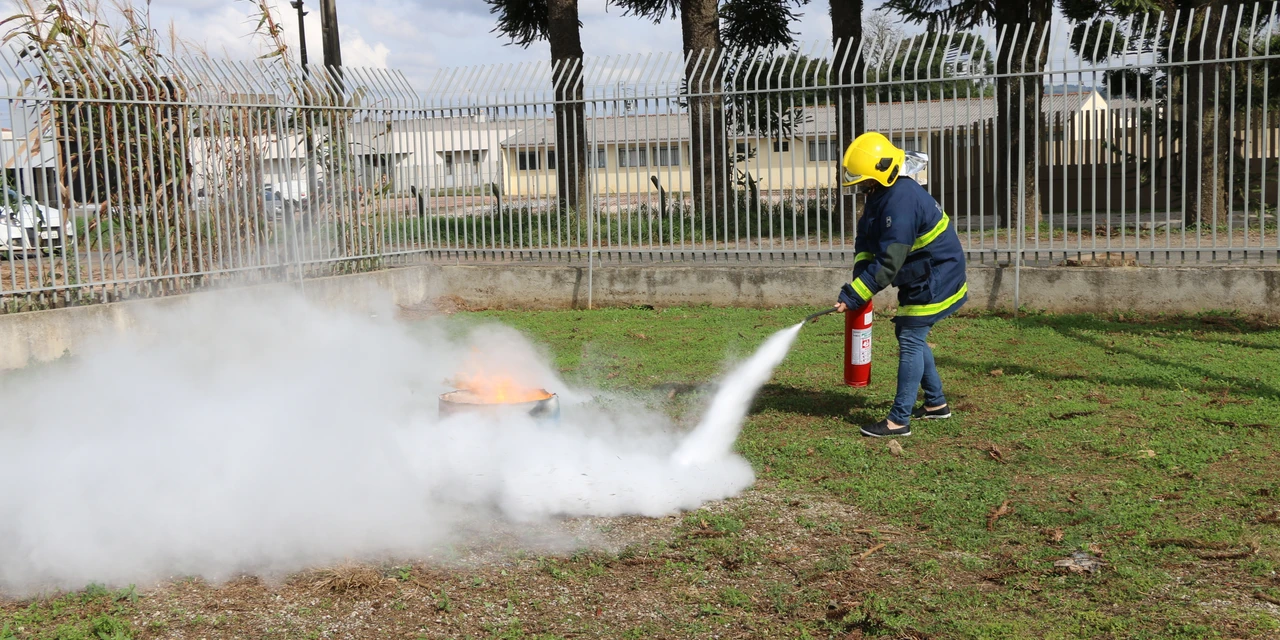 O Corpo de Bombeiros simulou princípio de incêndio utilizando combustível e os participantes realizaram atividade prática utilizando o extintor de acordo com a especificidade do material inflamável.