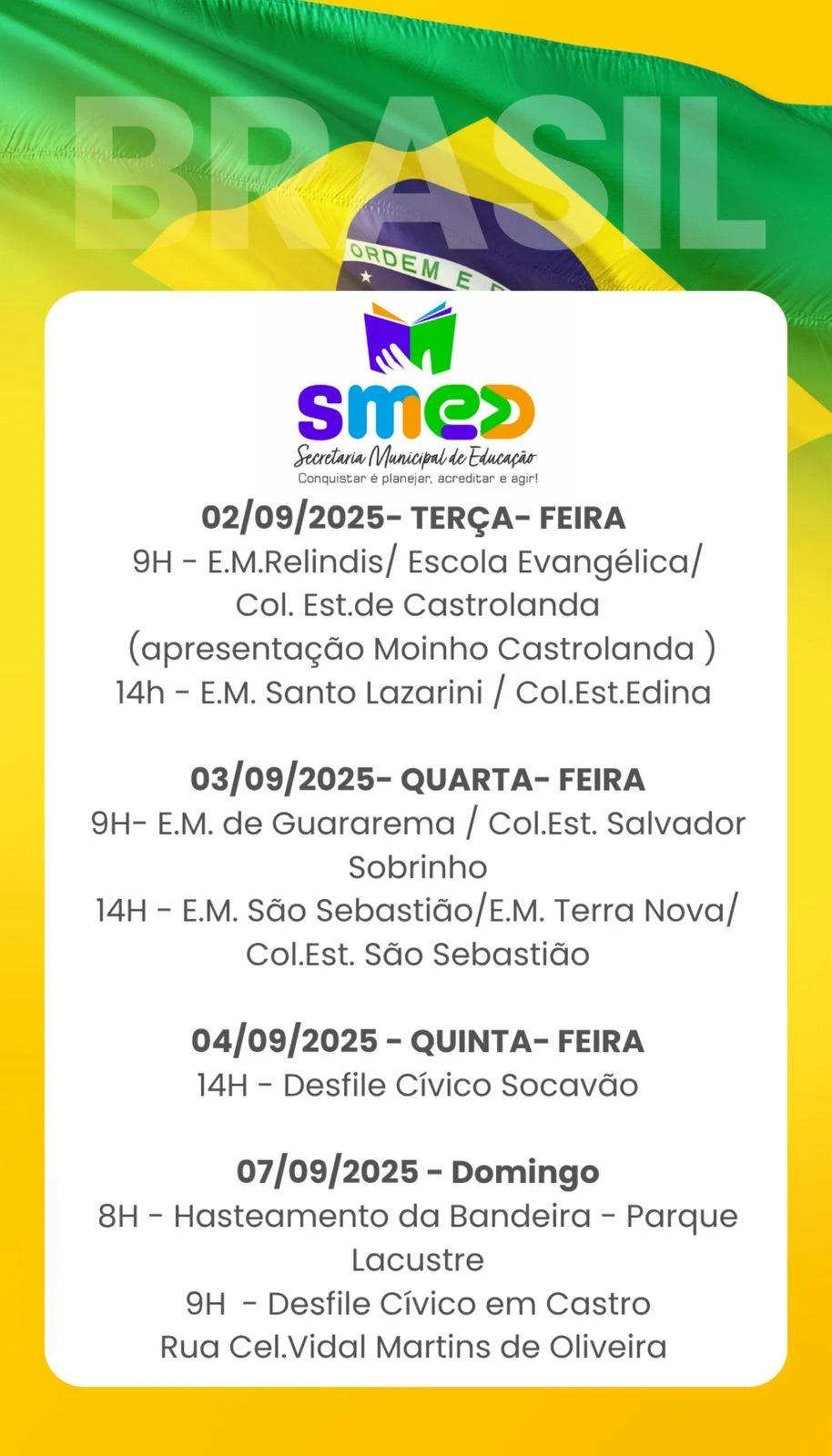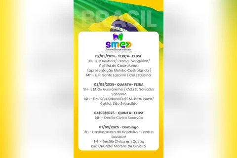 Link para inscrições no Desfile do Socavão.Link para inscrições no Desfile da Cidade.Programação das sessões cívicas no interiorDia 02 (terça)9h – CASTROLANDA
