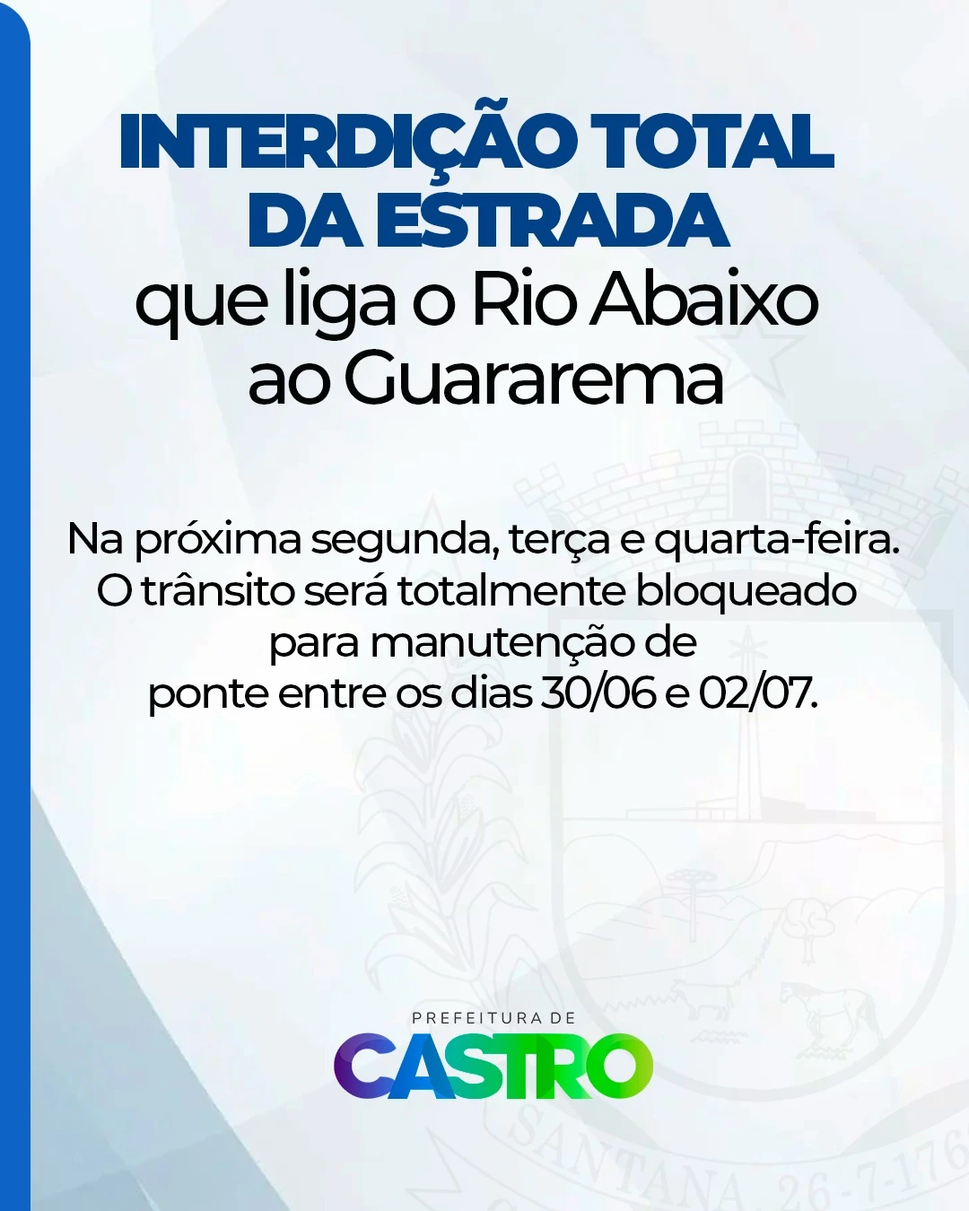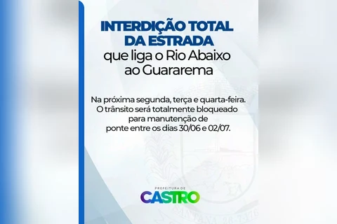COM ASSESSORIAS - A ponte da estrada que liga as localidades de Guararema e Rio Abaixo, no interior de Castro, será reconstruída na próxima semana. Para isso, a via será totalmente interditada entre segunda (30) e quarta-feira (02) e os moradores devem usar a rota alternativa, pela estrada dos Pereiras.
