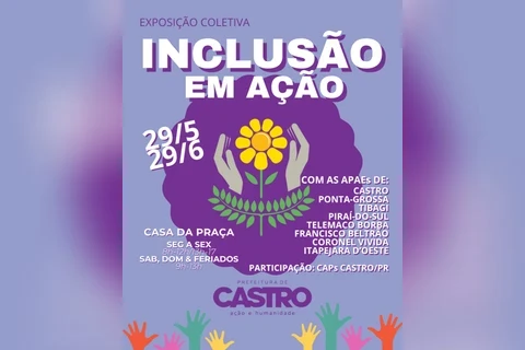 COM ASSESSORIAS - Entre os dias 29 de maio e 29 de junho, a Casa da Praça, em Castro, sedia a exposição coletiva Inclusão em Ação. A mostra reúne trabalhos artísticos de alunos de APAEs de oito municípios: Castro, Ponta Grossa, Tibagi, Piraí do Sul, Telêmaco Borba, Francisco Beltrão, Coronel Vivida e Itapejara d’Oeste, além do CAPS de Castro.