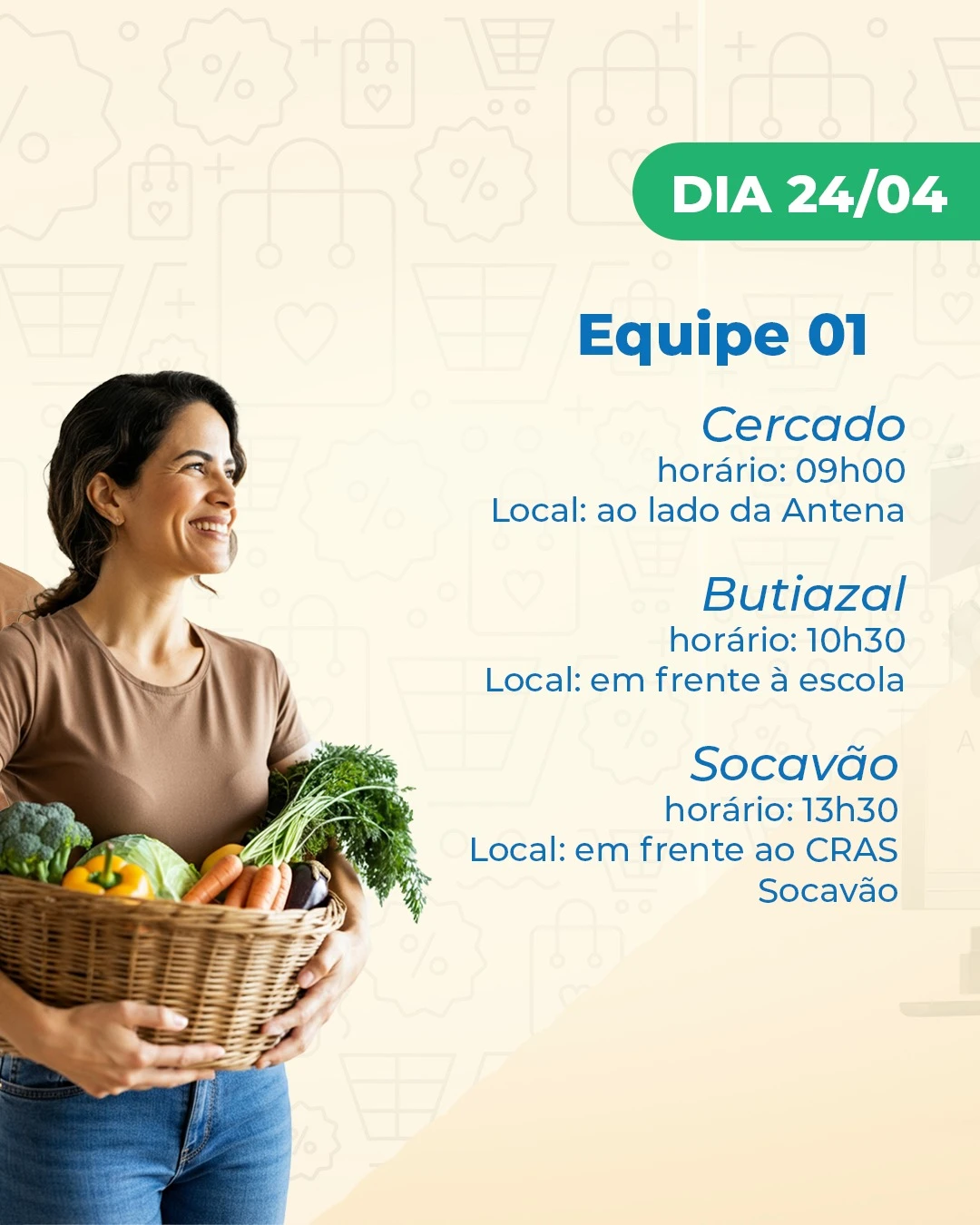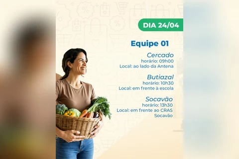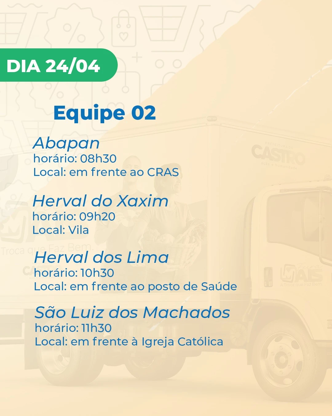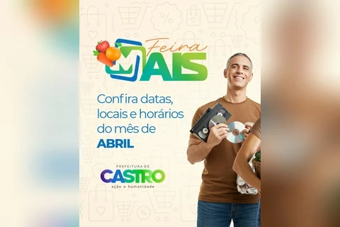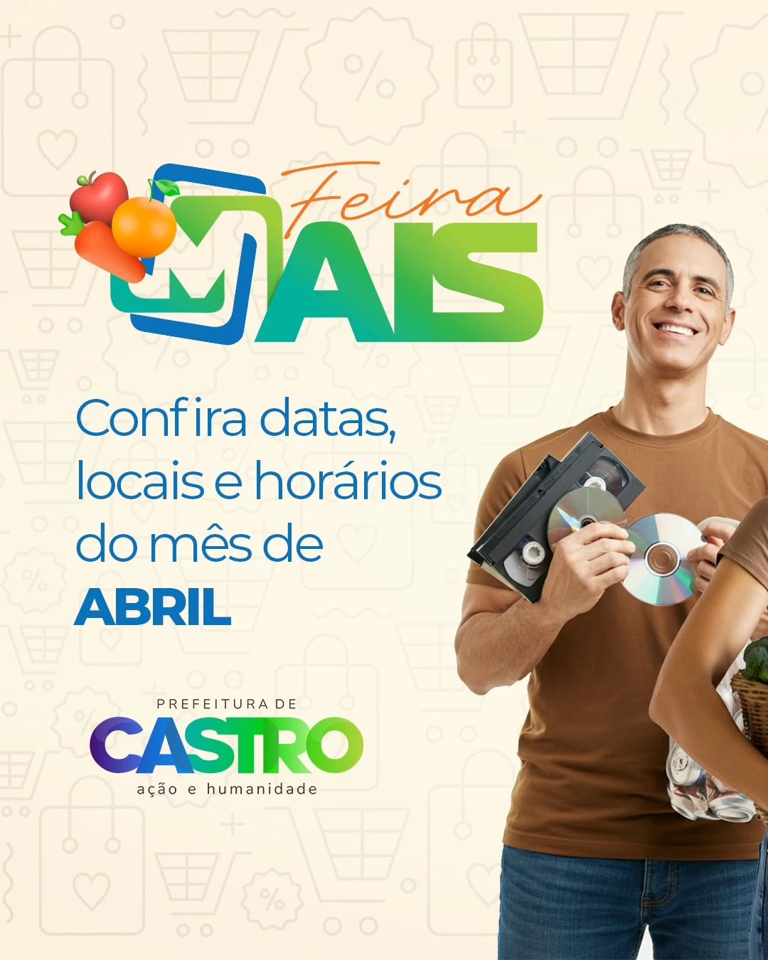 COM ASSESSORIAS - O 'Feira+', programa de troca de materiais recicláveis por alimentos, inicia suas atividades nesta quinta-feira (24) nas localidades de Cercado, Butiazal, Socavão, Abapan, Herval do Xaxim, Herval dos Limas e São Luiz dos Machados, na região rural de Castro. Na sexta-feira (25), a operação atende os bairros Bela Vista, Samambaia, Tronco, Vila Rosário. A agenda das próximas ações será divulgada sempre no site e nas redes sociais da Prefeitura.