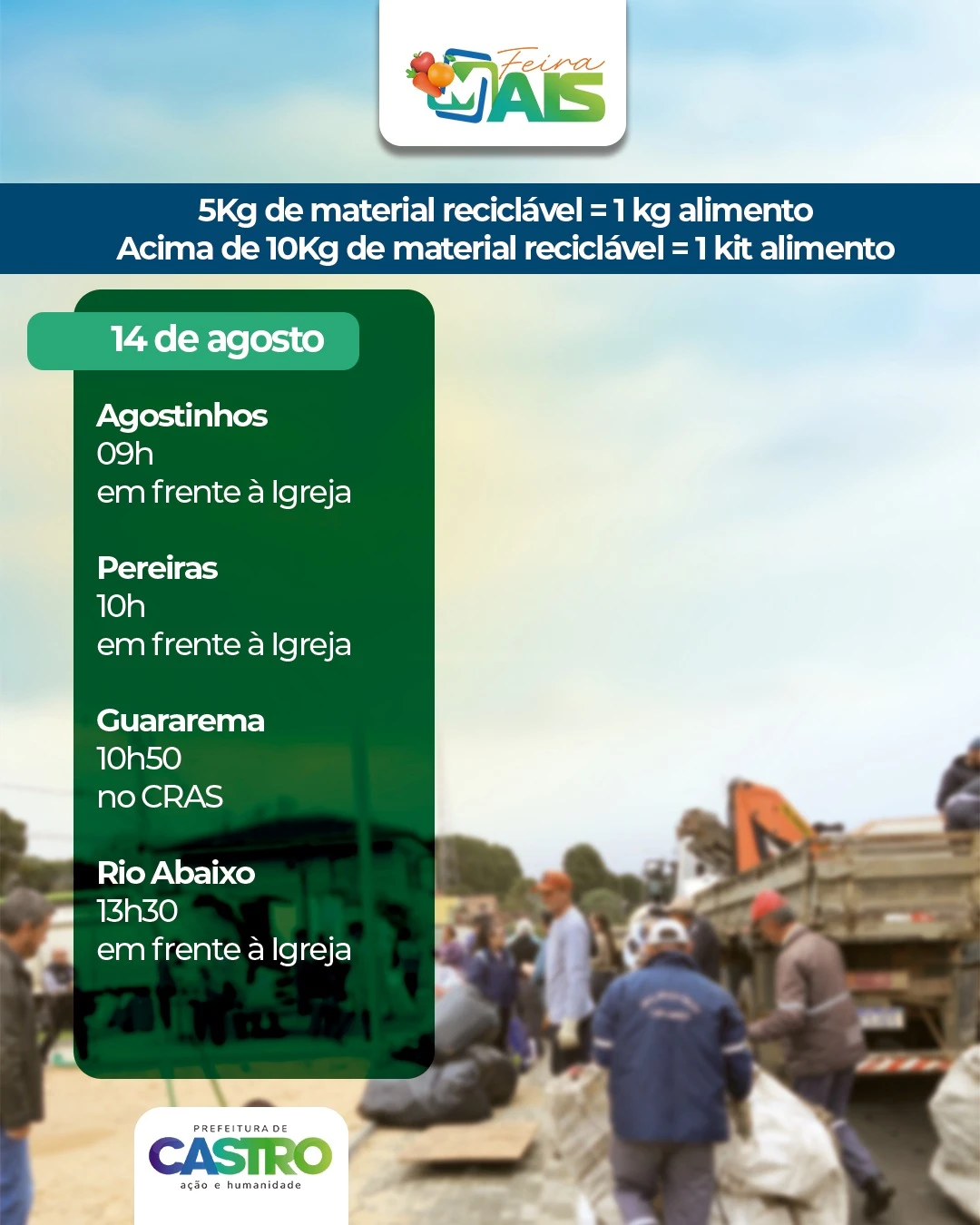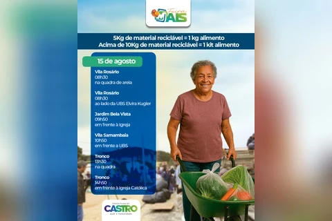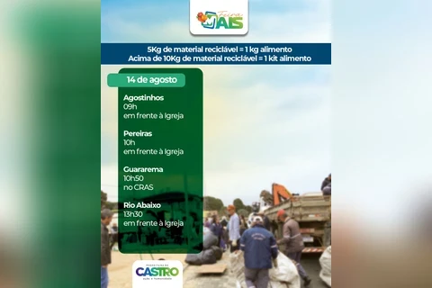 COM ASSESSORIAS - Oito bairros do interior e da cidade estão na programação do Feira Mais nesta semana, em Castro. O caminhão do programa que troca recicláveis por alimentos passará nesta quinta-feira (14) pelas comunidades de Agostinhos, Pereiras, Guararema e Rio Abaixo. Na sexta (15), o programa atende os bairros Vila Rosário, Jardim Bela Vista, Vila Samambaia e Tronco.