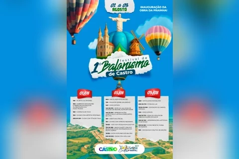 COM ASSESSORIAS - Shows com artistas nacionais e regionais, praça de alimentação com food trucks, exposição de carros, Feira da Lua especial e pôr do sol com DJ na ponte são algumas das atrações do 1º Festival de Balonismo de Castro, que marcará a inauguração da obra de revitalização da Prainha, o Parque Estanislau Libânio Cardoso, entre dias 1º e 03 de agosto.