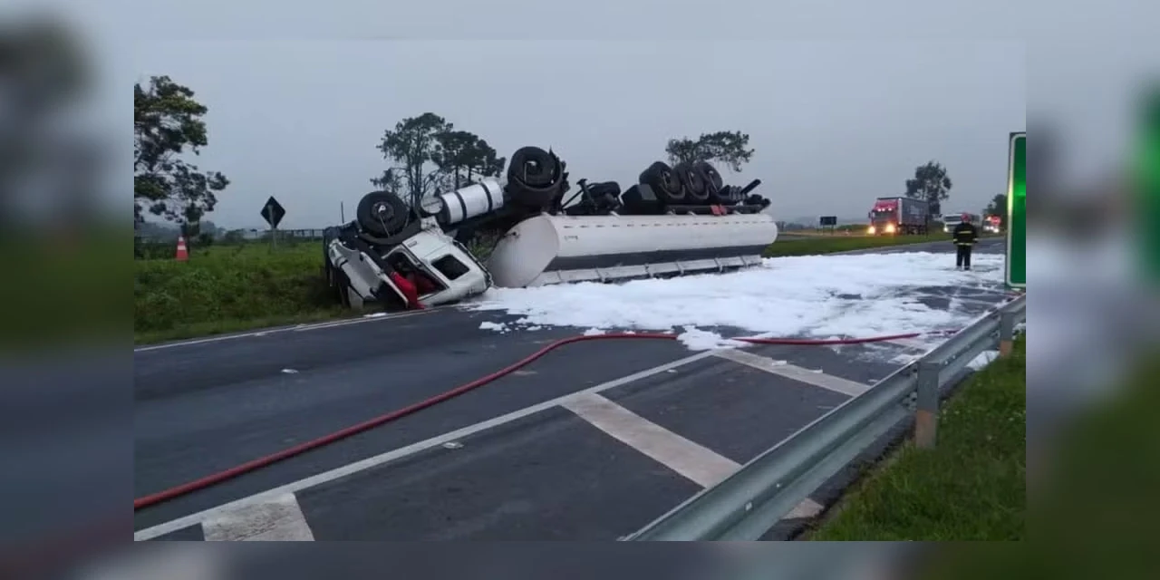 De acordo com a empresa, apesar do caminhão-tanque ter ficado com as rodas para o ar e ter derramado a carga de combustível na pista, não há risco de explosão.
