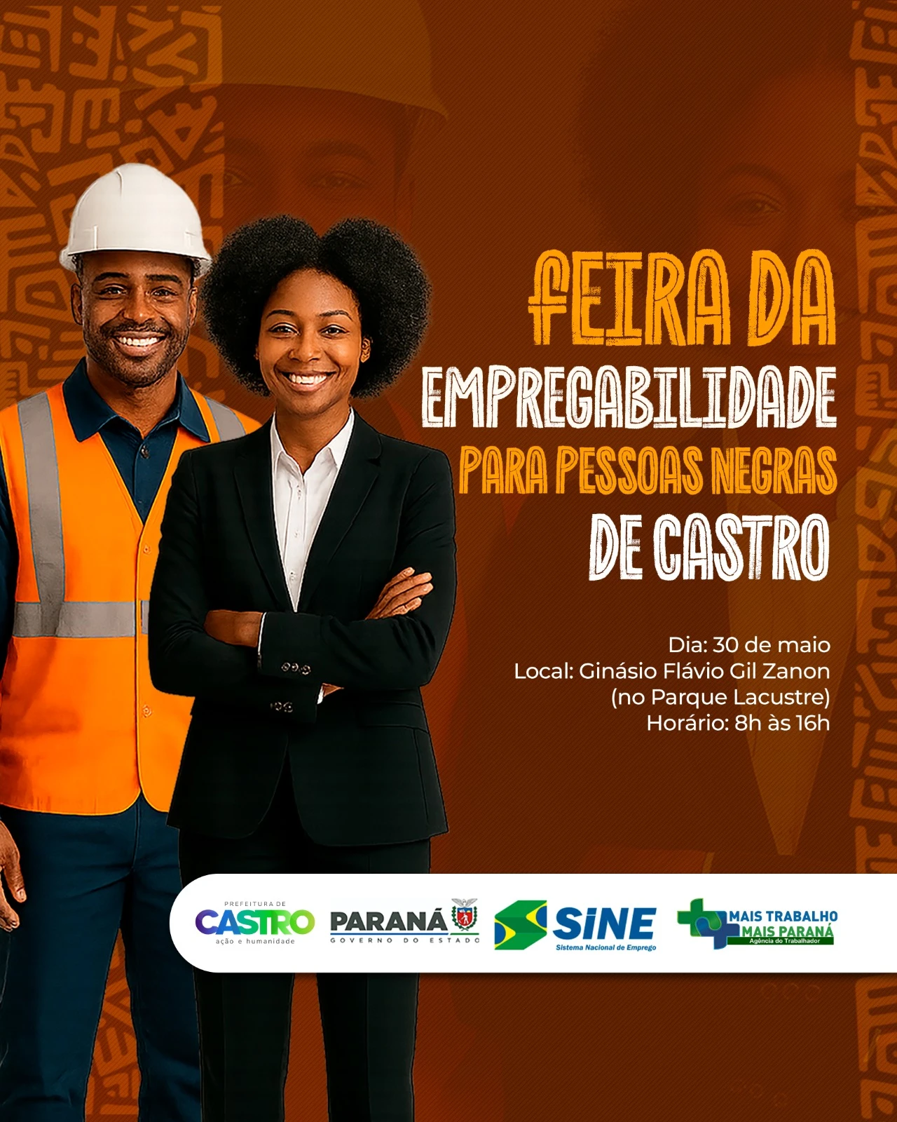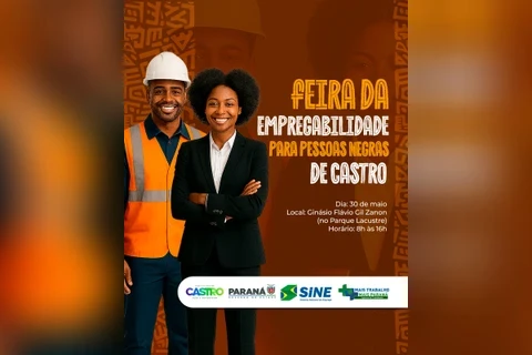 COM ASSESSORIAS - A Agência do Trabalhador promove nesta sexta-feira (30) a 1ª Feira da Empregabilidade para as Pessoas Negras de Castro. Em parceria com cinco empresas da cidade, a feira acontece das 8 às 16 horas no Ginásio de Esportes Flávio Gil Zanon, que fica no Parque Lacustre.
