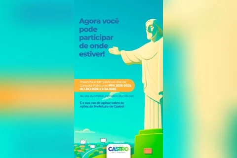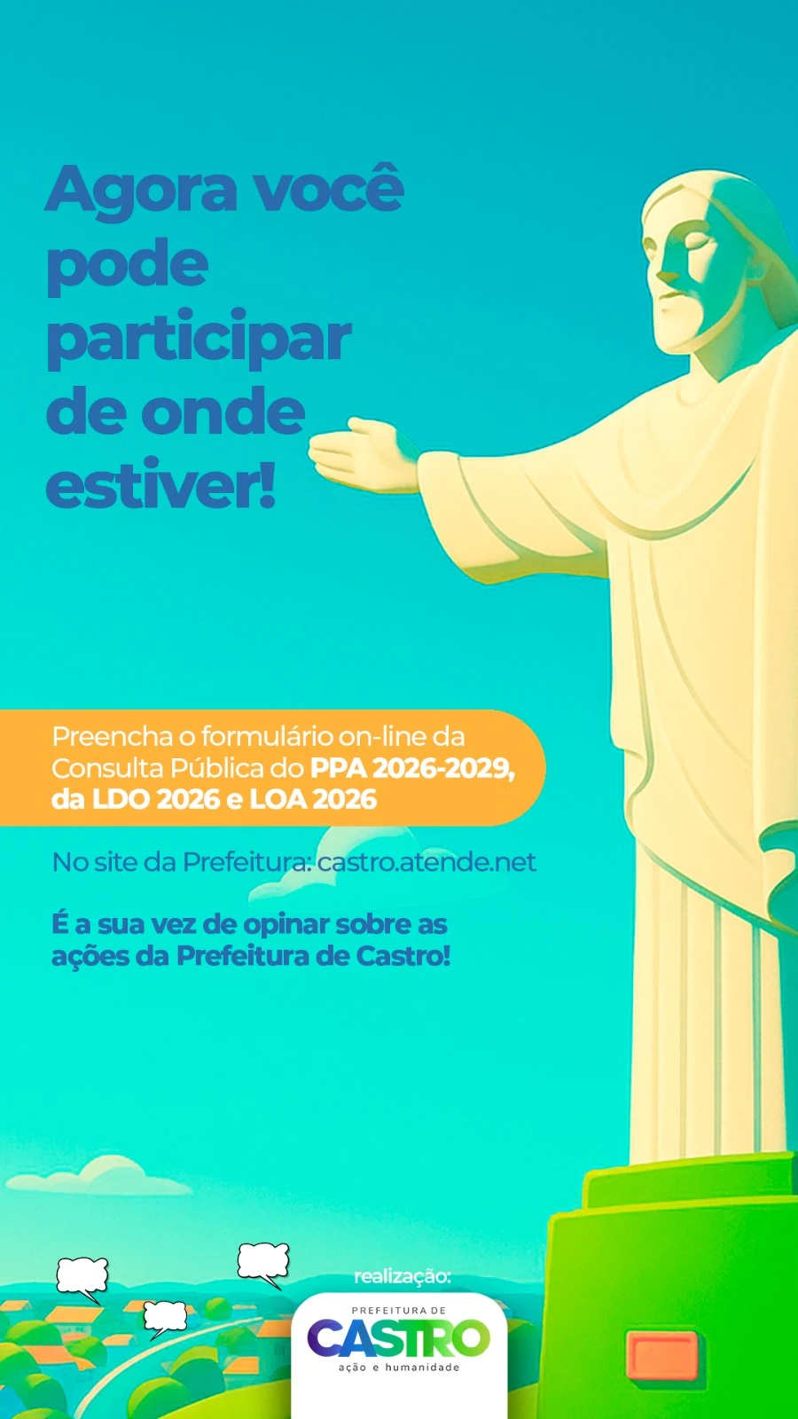 castro.atende.net) a Consulta Pública do PPA 2026-2029, da Lei de Diretrizes Orçamentárias 2026 (LDO) e da Lei Orçamentária Anual 2026 (LOA). Qualquer morador de Castro, de onde estiver, pode preencher o formulário e garantir sua participação no processo de planejamento das políticas públicas.