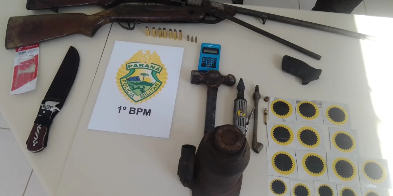 No local foram recuperados diversos objetos furtados - macaco hidráulico, bicos para encher pneus, máquina de retífica, máquina de cartão, ferramentas diversas, remendos para pneu, mil reais em espécie, uma faca, um simulacro de arma de fogo e munições calibre .357.