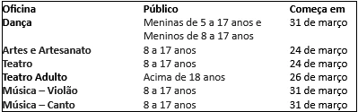 As aulas de dança podem ser feitas por meninas de 5 a 17 anos e meninos de 8 a 17 anos e começam dia 31 de março. Já as oficinas de artes (que inclui artesanato) e teatro são para crianças e adolescentes de 8 a 17 anos e começam dia 24 de março. O teatro adulto inicia dia 26 de março. As oficinas de música, com turmas de violão e de canto, são para o público de 8 a 17 anos e começam dia 31 de março.