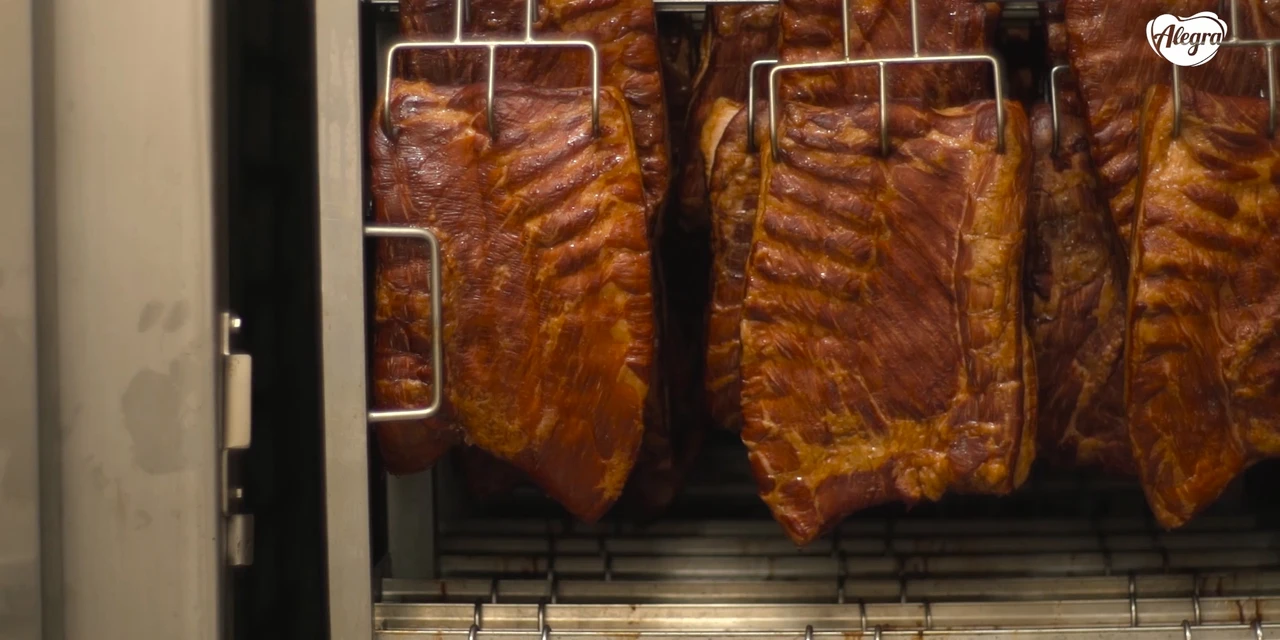 A defumação natural da Alegra é realizada com a queima lenta da serragem umedecida e dura cerca de uma hora. “Ao passar por um processo de defumação, os produtos cárneos reagem com os compostos da fumaça, que acentuam o sabor e o aroma do alimento, dando o gosto desejado e característico de um defumado”, explica Marina. A serragem utilizada segue um padrão para que todos os produtos tenham o mesmo sabor, e as madeiras mais recomendadas para esse processo são as duras e não resinosas.