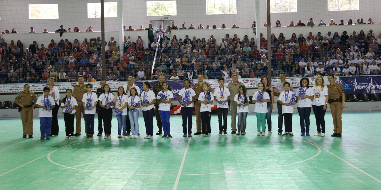 IMPRENSA/Castro - Alunos do 5º ano do ensino fundamental de 15 escolas municipais de Castro participaram nesta terça-feira (5) da formatura do Programa Educacional de Resistência às Drogas e à Violência – Proerd, em solenidade no Ginásio de Esportes Padre José Pagnacco que contou com a presença de autoridades civis e militares, além de pais de alunos. Durante o ano, 1100 alunos participaram do programa.