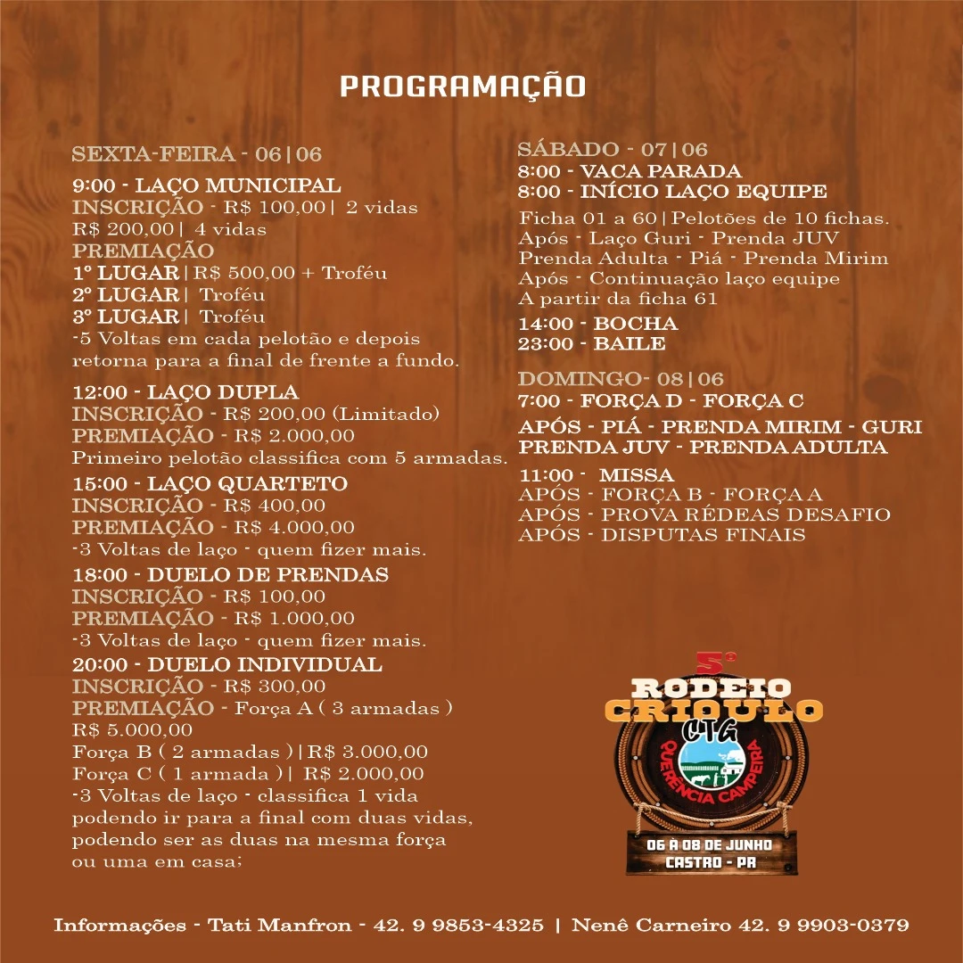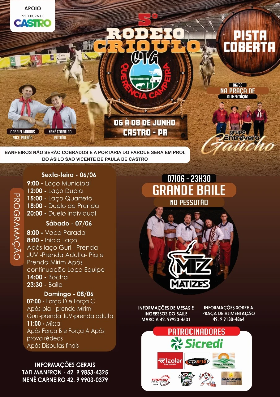 COM ASSESSORIAS - A 5ª edição do Rodeio Crioulo promovido pelo Centro de Tradicionalismo Gaúcho Querência Campeira deve atrair mais de mil competidores ao Parque de Exposições Dario Macedo, em Castro, entre dias 06 e 08 de junho. Com provas de laço, vaca parada e de rédeas, entre outras disputas tradicionalistas do campeirismo gaúcho, na pista de laço coberta, o evento que tem apoio da Prefeitura também terá baile com o grupo Matizes, no sábado (07), no clube Pessutão. Na praça de alimentação, haverá ainda show com o grupo Entrevero Gaúcho na sexta (06).