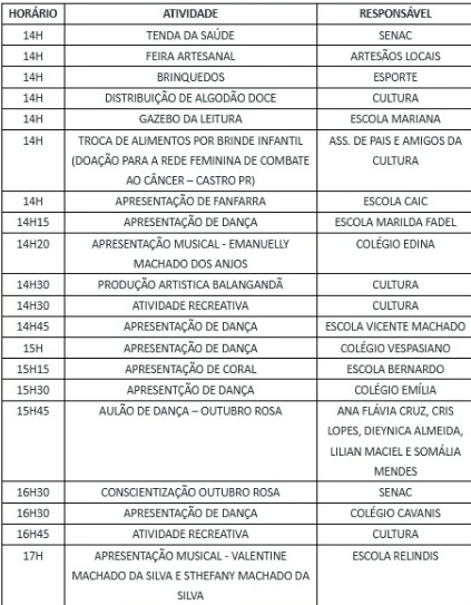 COM ASSESSORIAS - A Secretaria Municipal de Cultura, Indústria, Comércio e Turismo realiza neste sábado (8) na Praça Manoel Ribas, o Sabadão Cultural em comemoração ao Dia da Criança e ao Outubro Rosa. A programação será das 14h às 18h com diversas atividades como dança, recreação, gazebo da leitura, conscientização sobre o Outubro Rosa, entre outras.