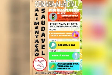 Uma das atividades será uma blitz educativa em pontos estratégicos da cidade com o lançamento do “Desafio da Alimentação Saudável” com sugestões práticas de mudanças positivas na alimentação, visando tratar do tema com a população e incentivar a adoção de práticas saudáveis como a redução do sal no preparo dos alimentos, inserção de frutas diferentes na alimentação, maior consumo de água e mais verduras no prato. Essa atividade envolverá alunos de 15 escolas que vão distribuir material informativo, frutas e água durante a blitz.