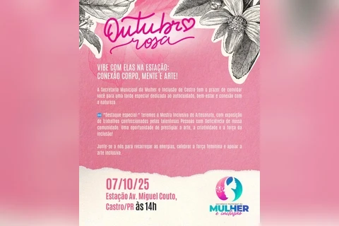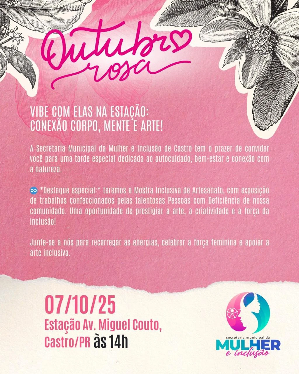 COM ASSESSORIAS - Em clima de renovação e valorização da inclusão, a Secretaria Municipal da Mulher e Inclusão de Castro promove no dia 07 de outubro o evento “Vibe com Elas na Estação: Conexão, Corpo, Mente e Arte”, dentro da programação da Semana de Castro 2025. A iniciativa integra as ações do Outubro Rosa e convida a comunidade para uma tarde dedicada ao autocuidado, bem-estar e conexão com a natureza. A participação é gratuita, mas é indicado confirmar presença antecipadamente