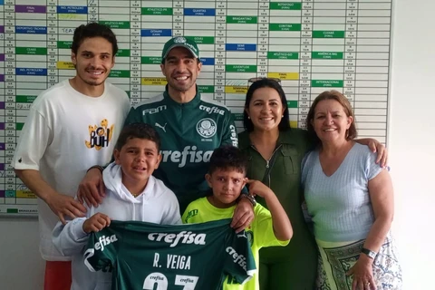 Raphael Veiga, craque do Palmeiras, faz "tour" com torcedor mirim piraiense pelo CT do clube
