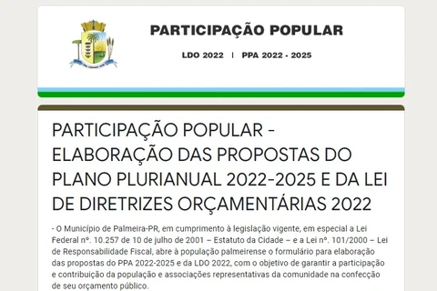 Palmeira - Participação popular online para PPA e LDO está disponível