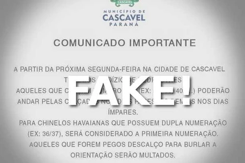 Decreto que estabelece rodízio de pedestres por numeração do calçado em cidades do Paraná é fake