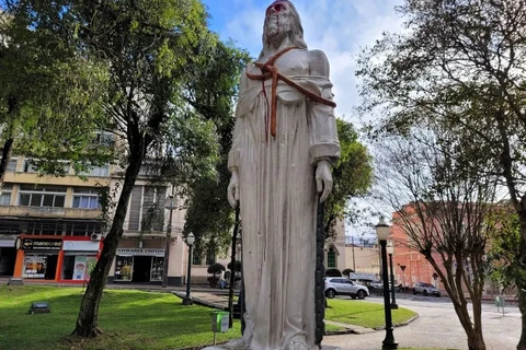 Estátua de Tiradentes é pichada no Centro de Ponta Grossa; Guarda Municipal tenta identificar os responsáveis